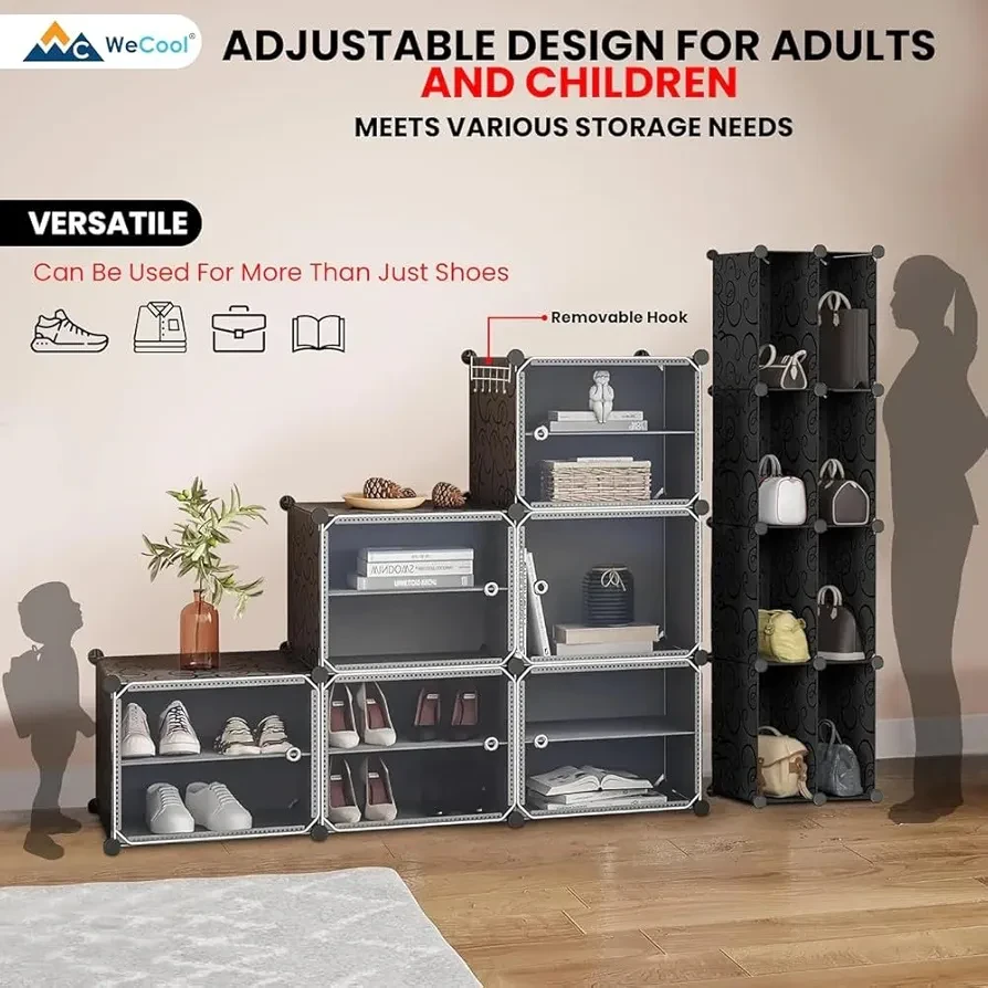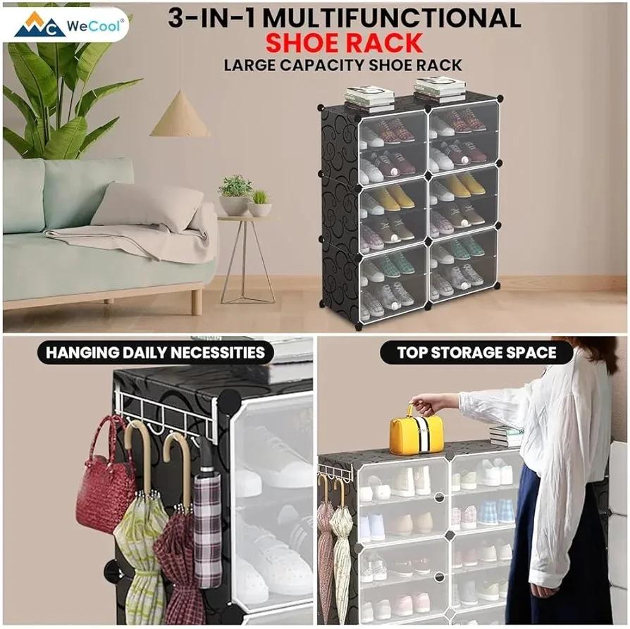 🏆【𝐒𝐭𝐨𝐫𝐚𝐠𝐞 𝐀𝐩𝐥𝐞𝐧𝐭𝐲】This versatile plastic shoe rack organizer, able to accommodate up to 24 pairs of shoes, doubles as storage for bags and clothing. Its space-saving side hooks offer a handy spot to hang hats or keys 👍【𝐑𝐨𝐛𝐮𝐬𝐭 𝐚𝐧𝐝 𝐒𝐞𝐜𝐮𝐫𝐞】This high-quality shoe rack is Crafted with premium connectors, durable plastic panels, and strong steel wire, each cube of this shoe storage cabinet holds up to 10 Lbs. |